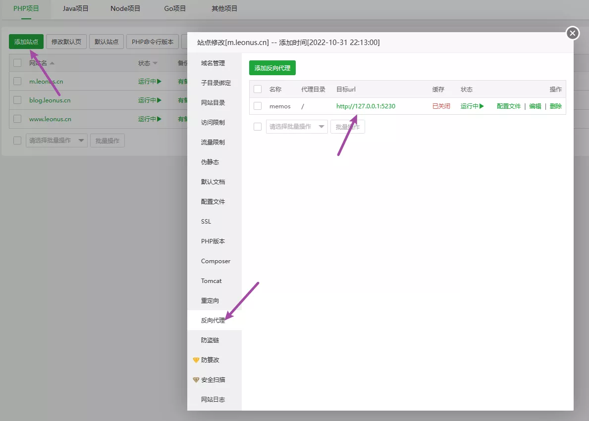 操作如下:在宝塔面版 新建网站 -> 设置 -> 反代 -> 添加代理 -> 设置名称和目标url即可。如下图: